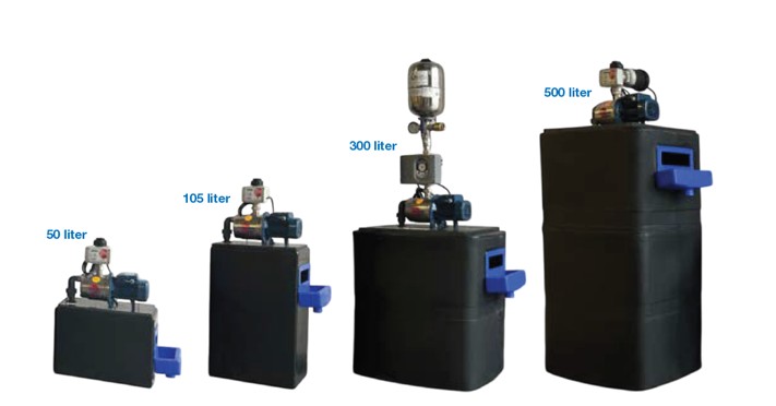 Suevia levert een 4-tal standaard breektanks met een inhoud van 50, 105, 300 en 500 liter. Allen voorzien van een AB onderbreking en gewenste besturingspomp.